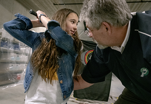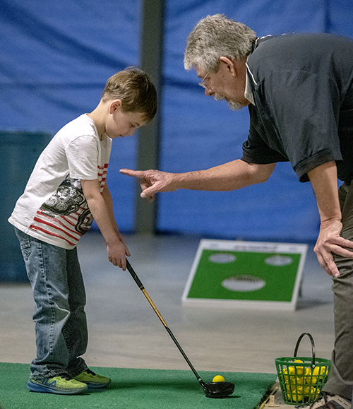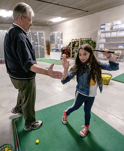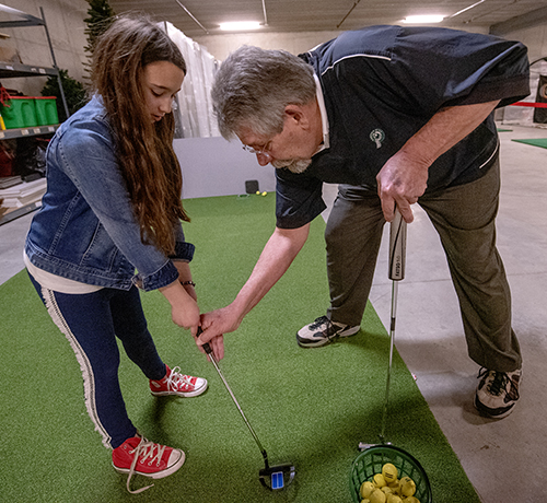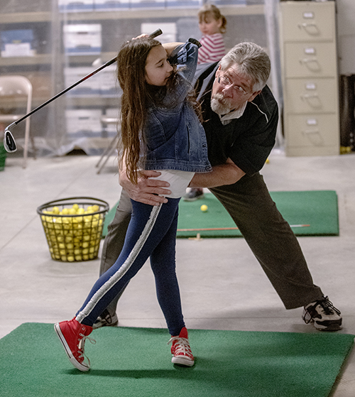 Golf Instructor William Below helps Ella Stoner, 9, of Somers with her swing during the golf clinic held in the Village/Town Hall basement. Source: Village of Somers.