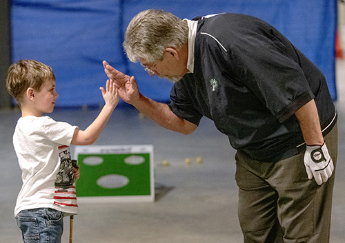 Golf Instructor William Below gives Ryan Smerz, 7, of Pleasant Prairie, a high five aftyer taking a good swing during the golf clinic. Source: Village of Somers.