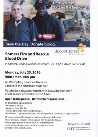 Somers Fire & Rescue is hosting a Blood Drive on behalf of the BloodCenter of Wisconsin on Monday, July 25, 2016.