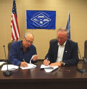 GEORGE STONER, VILLAGE PRESIDENT AND BEN HARBACH, TOWN CHAIRMAN SIGN THE INTERGOVERNMENTAL COOPERATION AGREEMENT ON OCTOBER 20, 2015 AFTER A UNANIMOUS VOTE BY BOTH TOWN AND VILLAGE BOARDS