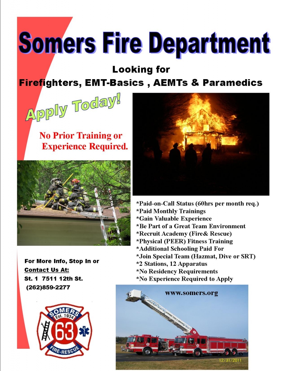 Somers Fire & Rescue Department is always looking for paid-on-call Firefighters, EMT-Basics, AEMT’s, and Paramedics.  No prior training or experience is required.