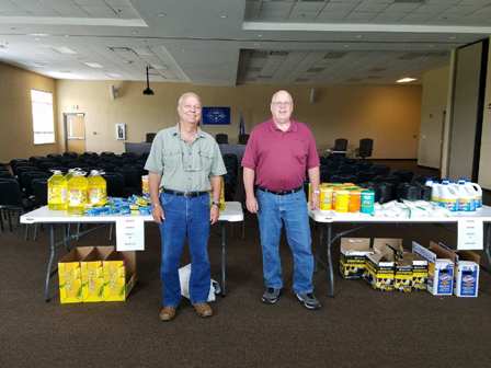 Village President George Stoner and Trustee Gregg Sinnen distribute cleaning supplies to residents who experienced flood damage.