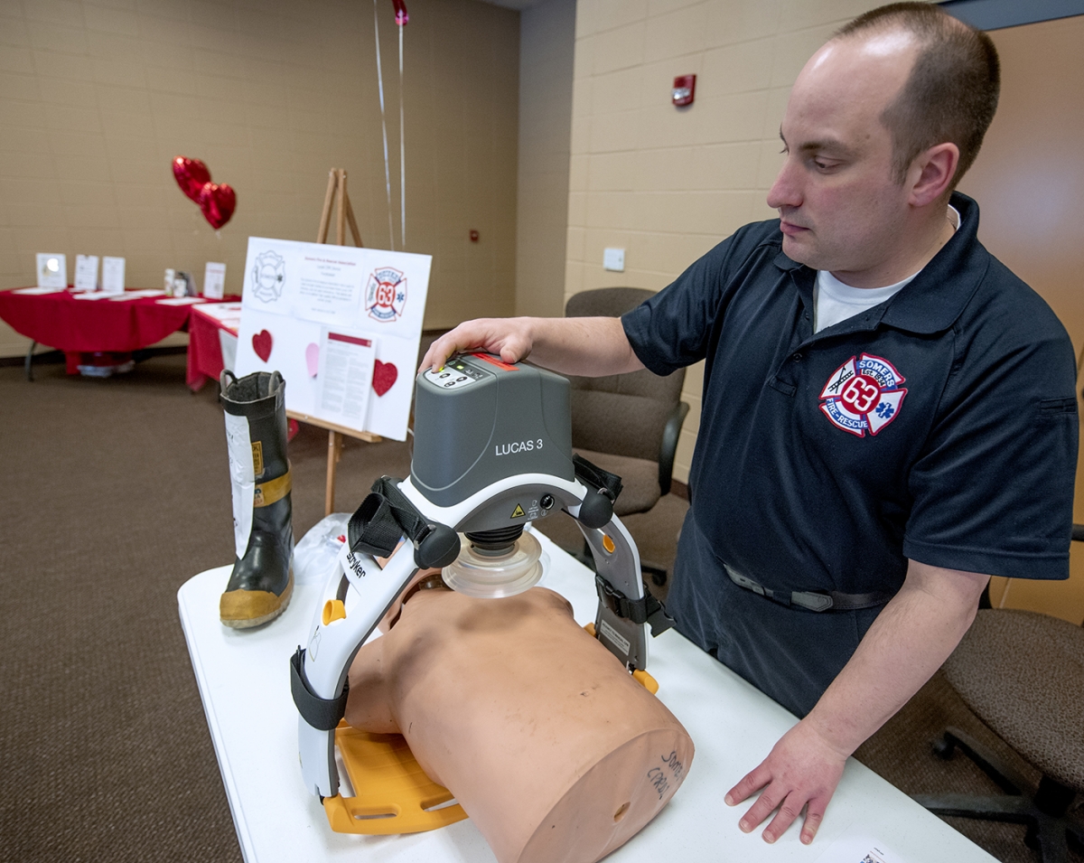 Somers Firefighter/Paramedic Adam Pisula demonstrates how the Lucas device works. Source: Village of Somers
