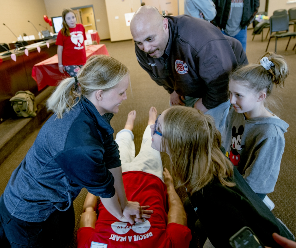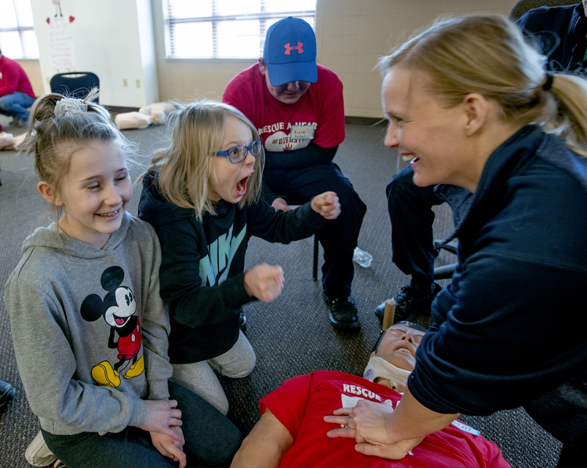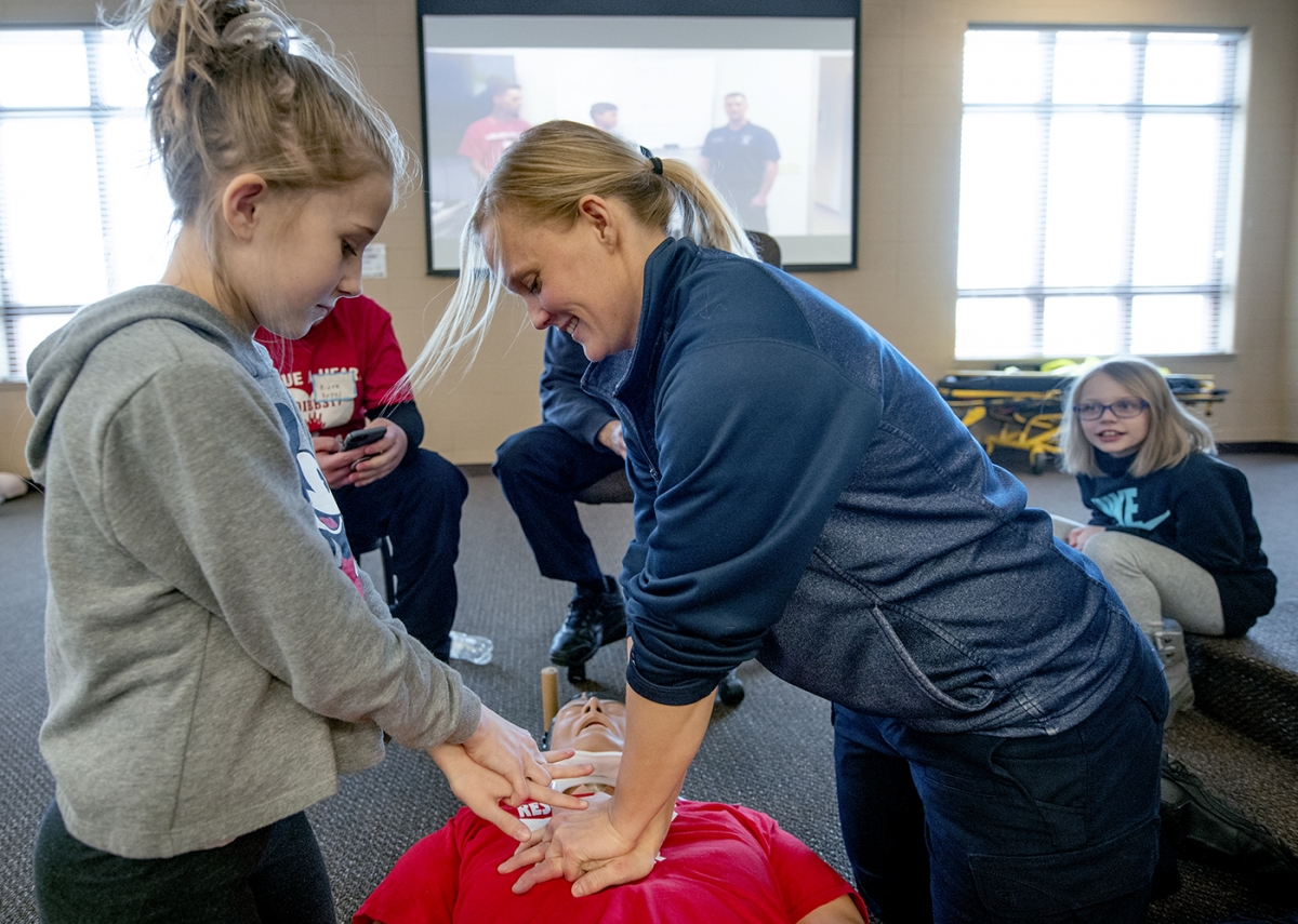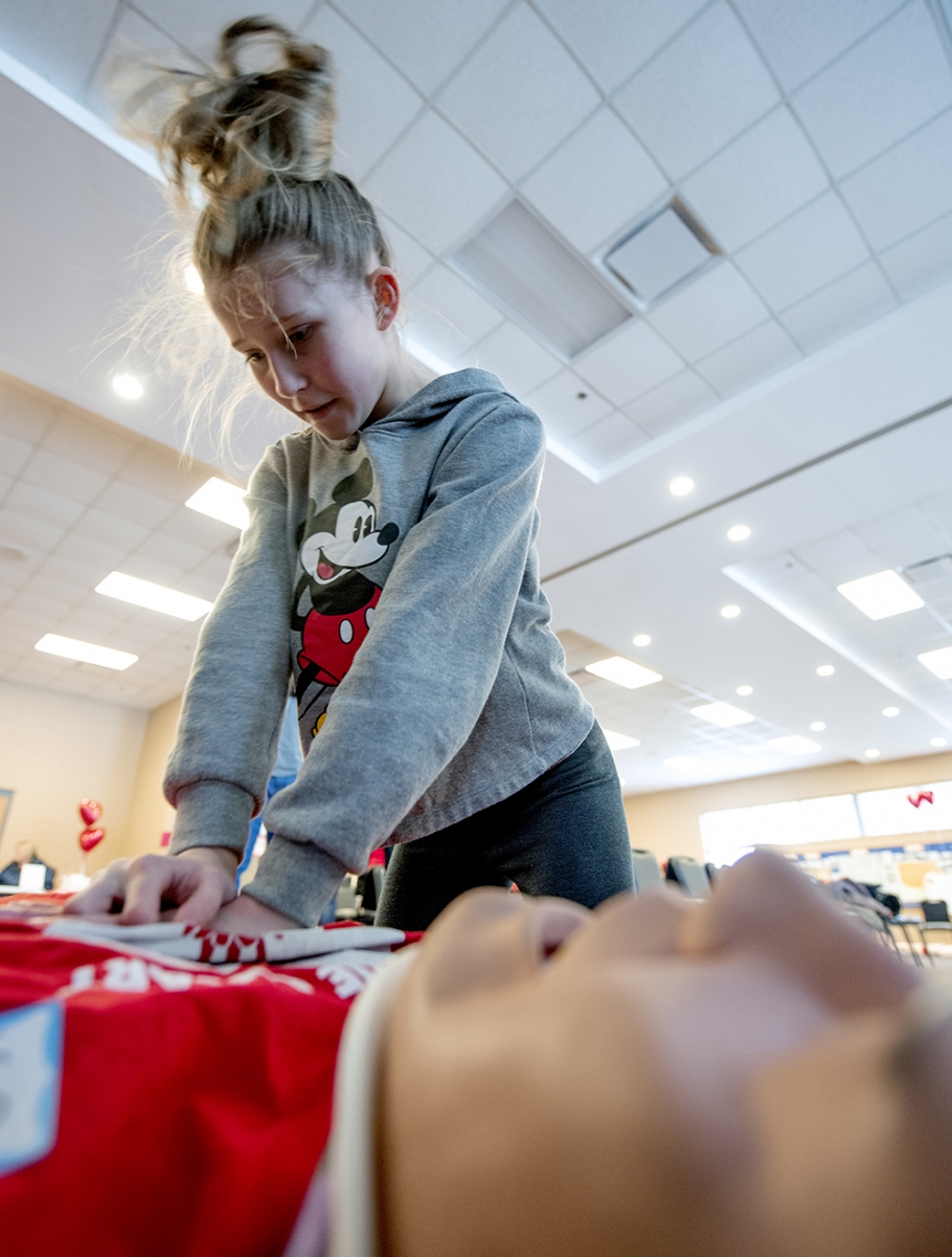 Lexi Kevan, 12, of Kenosha, took part in the event, pushing hard on the chest of a training dummy.