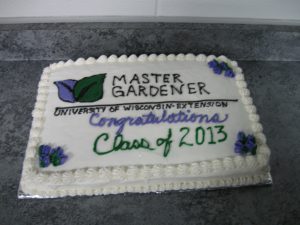 Tuesday, December 5, 2013, was the final class for a group of thirty-five students who enrolled in the twelve-week UW-Extension Master Gardener Volunteer Level I Course held in the training room of the Somers Town Hall. All thirty-five students passed their test which was cause for a celebration reception and cake. The home-made decorated cake was provided by Donna Zarovy, a member of the support staff in the UW-Extension office in Kenosha County.