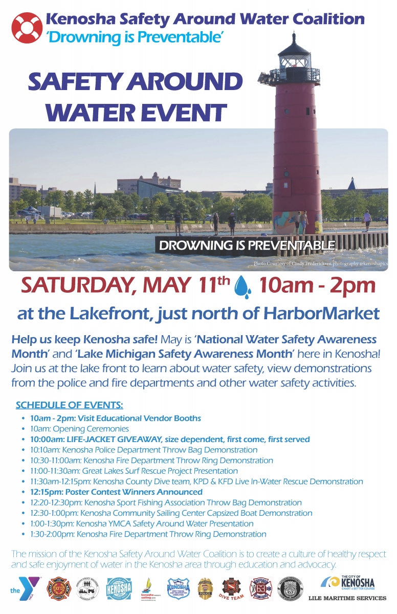 In celebration of May being National Water Safety Awarness Month, the Kenosha Safety Around Water Coalition is holding safety demonstrations from 10 a.m. to 2 p.m. Saturday May 11 at the lakefront just north of HarborMarket.