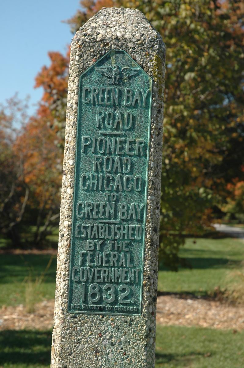 The historic Green Bay Road began in Chicago at the north end of the Michigan Boulevard bridge and commenced north to Gross Point (now Evanston), through Waukegan three miles inland, Kenosha five miles inland, Racine about the same distance, and points north to Green Bay.