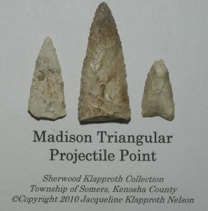 Madison Triangular Projectile Point (Late Woodland Period 400 – 1,100 BC) found on theh Klapproth Farm, Somers, Kenosha County