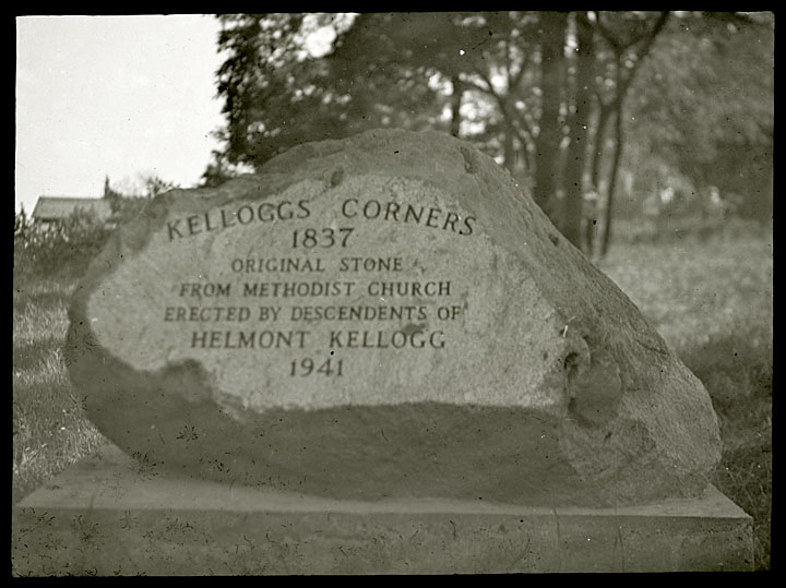 The day commemorating the 104th anniversary of that first prayer and Sunday School, following the arrival of these Kellogg brothers and their families, to that little patch in the woods that later became known as Kellogg’s Corners, some sixty of their descendants met in reunion on the site of this first church. A beautiful feature of this reunion was the dedicatory service of a large boulder that was one of the original corner stones of the church foundation. The unveiling was by two boys, Donald Mann, of Los Angeles, California, and James Beall, of Chicago, both descendants of the Kellogg’s. This boulder is beautifully engraved, and permanently set – a grand tribute to those early pioneers who came.”