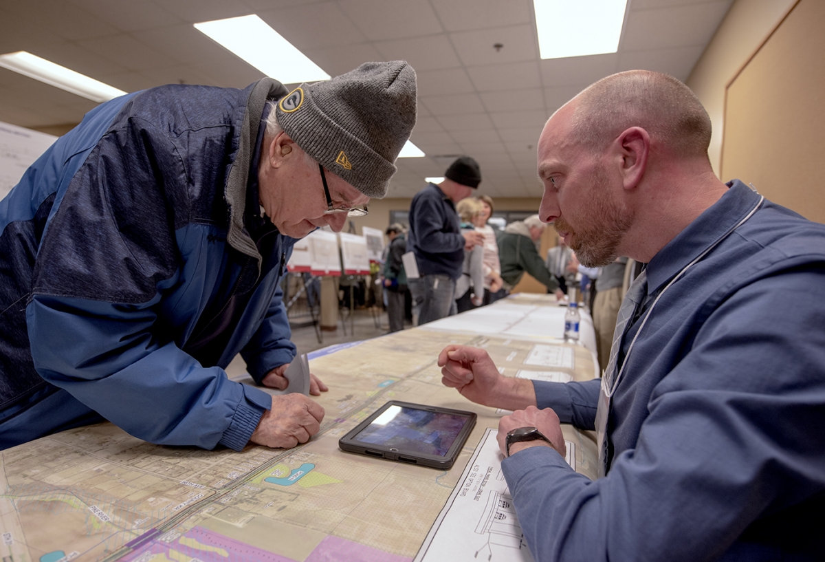 Somers resident Harold Bouse, left, asks engineer Nick Damro about how the KR project will effect his property.  Source: Village of Somers.