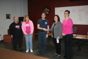 Firefighter Jake Farfalla, center, of the Somers Fire and Rescue Department, presents a check from the Somers Fire and Rescue Association in the amount of $560 to Debbie Misurelli, second from right, president of Circle of Hope, during the December 2014 Department general meeting. Somers Fire and Rescue Department members raised money for the organization through the sale of pink and navy Somers Fire Department T-shirts in the fall of 2014. Pink is the widely used color to commemorate the fight again breast cancer.