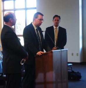 Adam J. Moore (First Industrial), Adam Artz (Pinnacle Engineering Group), and Brian Kluever addresses questions raised by members of the Plan Commission.