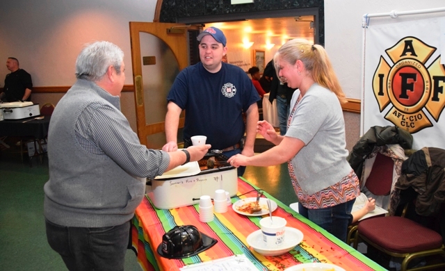 Somers Firefighter/EMT Ben Andersen, center, and Tara Strom, wife of Somers Training Capt. Aaron Strom, serve up chili during the Winterfest Chili Cook-off held Feb. 21 at Roma Lodge in Mount Pleasant. The cook-off was a competition of chili recipes from about 20 area fire and police organizations and the team of Somers Professional Firefighters Local #4831 took first place in the competition. Proceeds raised at the event, co-sponsored by Roma Lodge and the South Shore Fire Dept.’s firefighters local, will go to the Professional Fire Fighters of Wisconsin Charitable Foundation Inc. and its summer camp for burn-injured children. The annual camp takes place every summer at Camp Timberlee near East Troy.